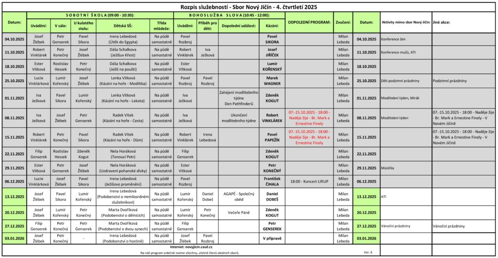 Program sboru PROGRAM BOHOSLUŽEB: 09:00 – Sobotní škola (studium Bible) – dospělí a děti 10:30 – Přestávka 10:45 – Kázání 14:00 – Odpolední program
