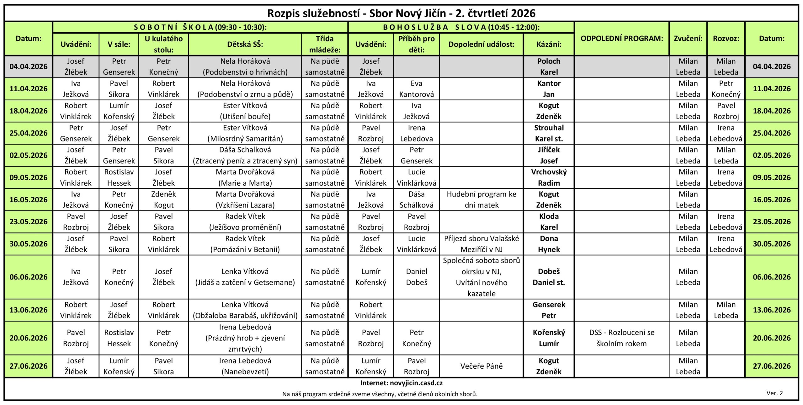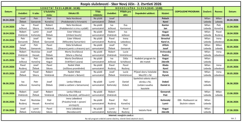 • 09:30 – Sobotní škola (studium Bible) – dospělí a děti